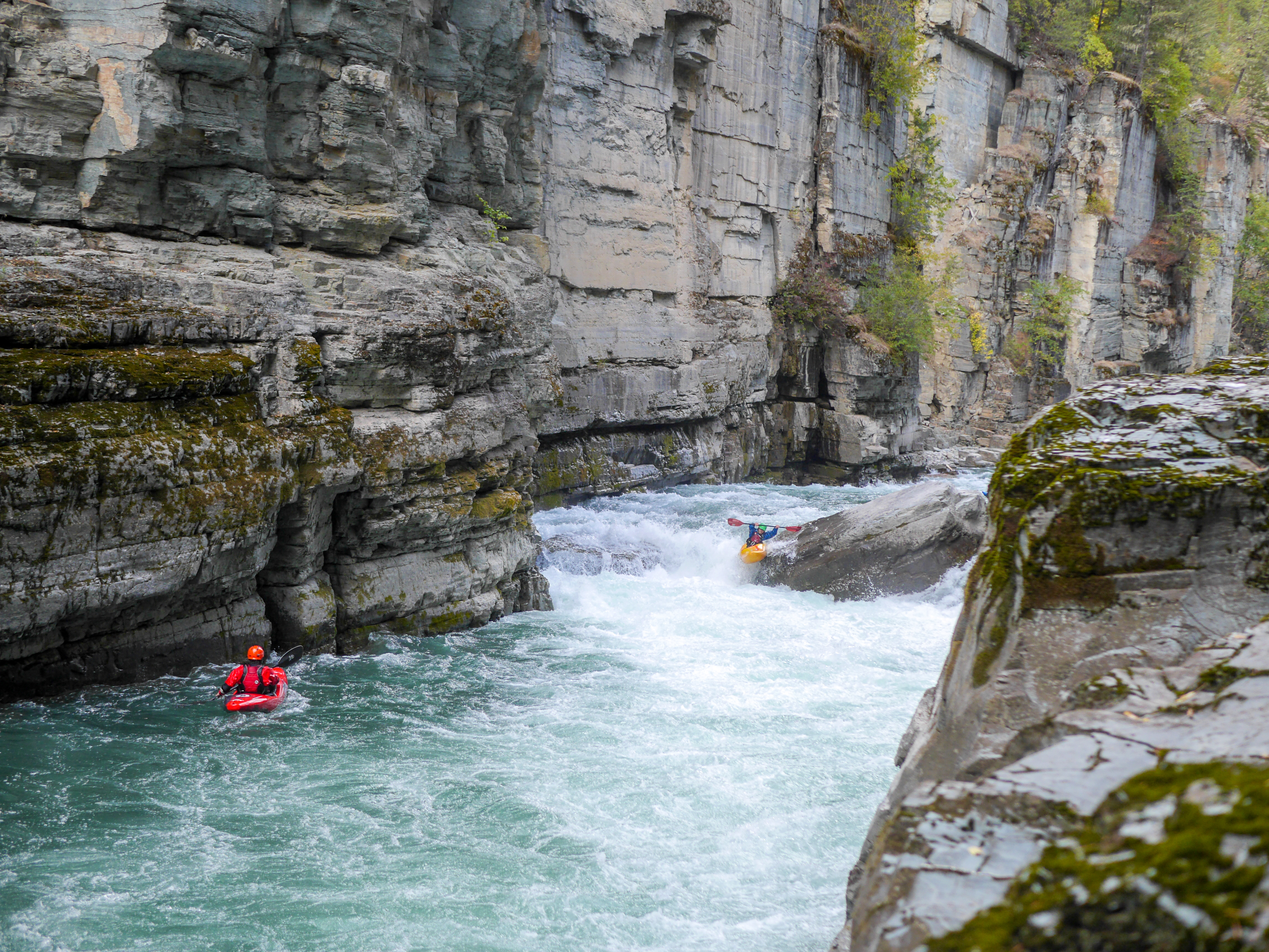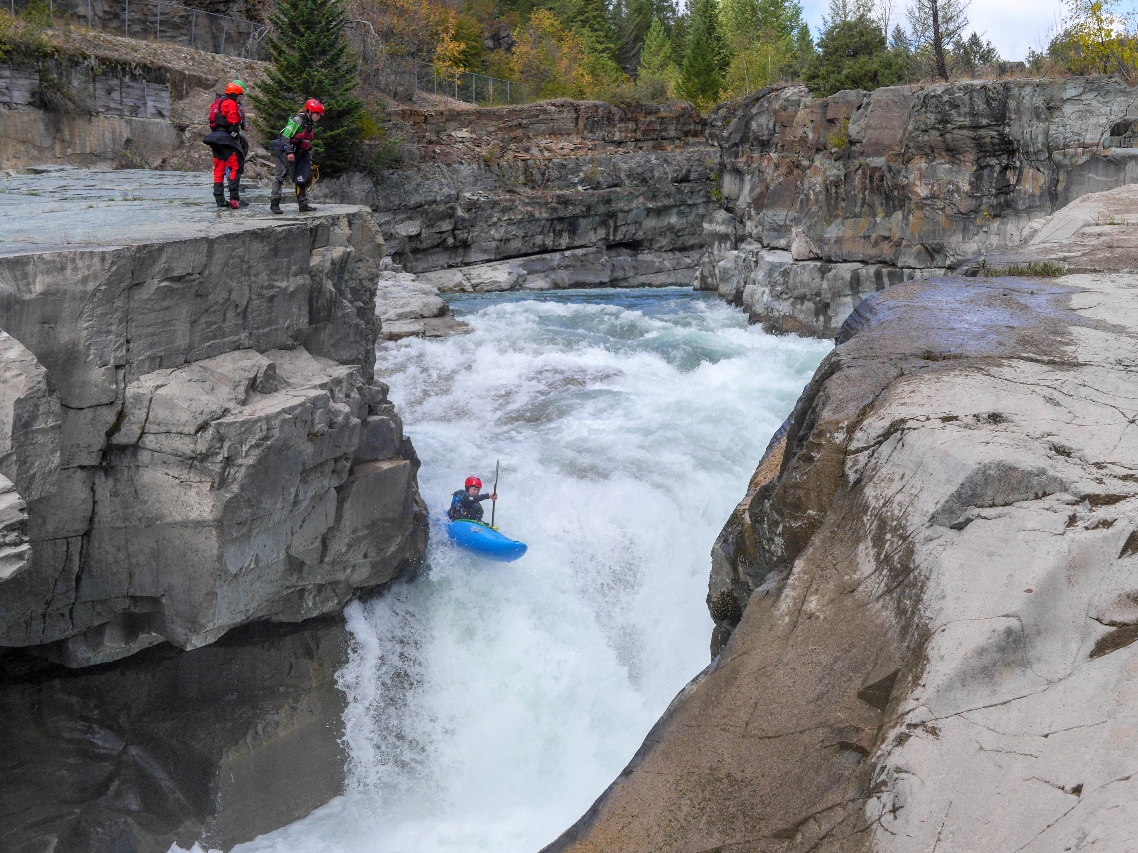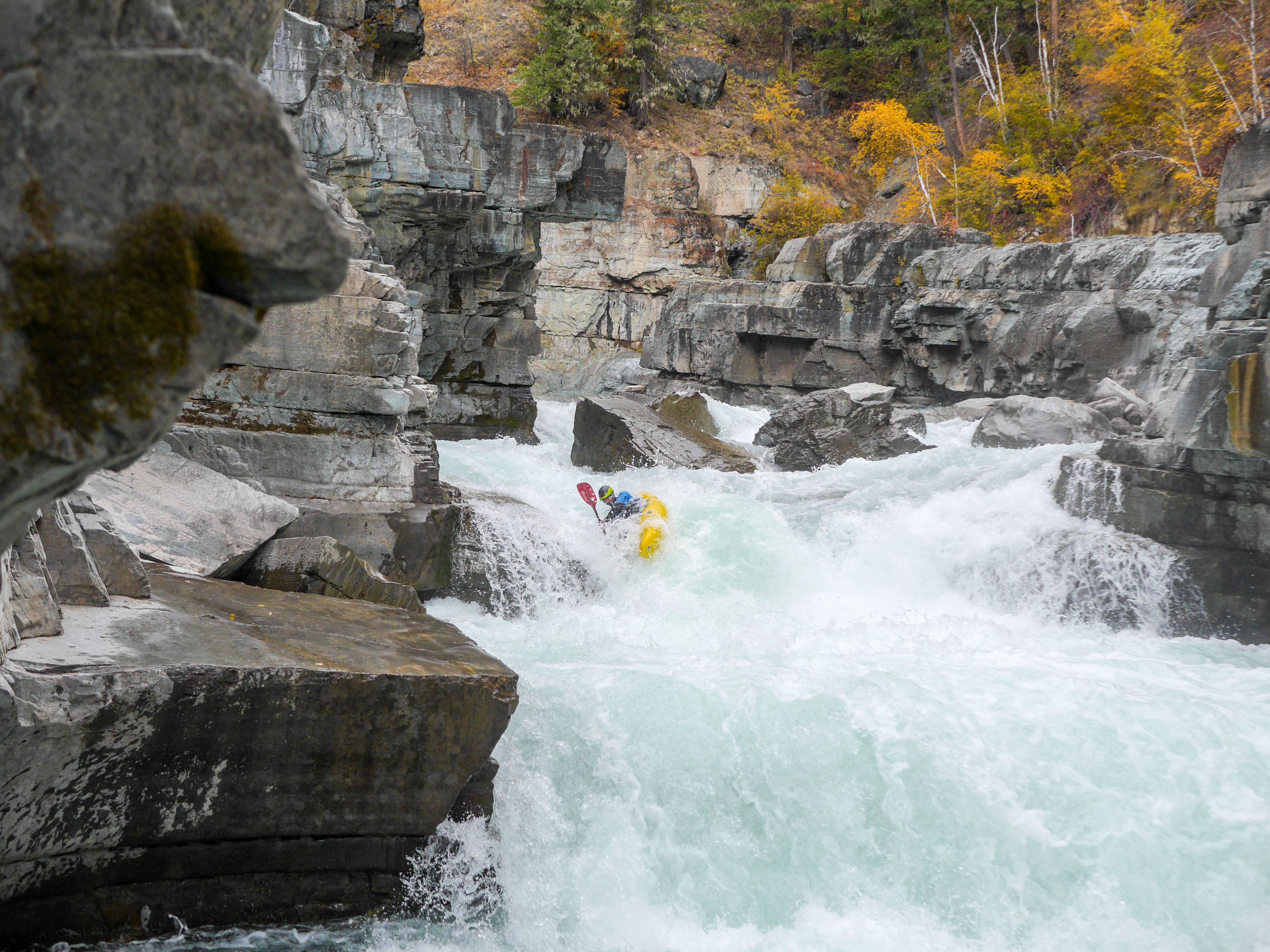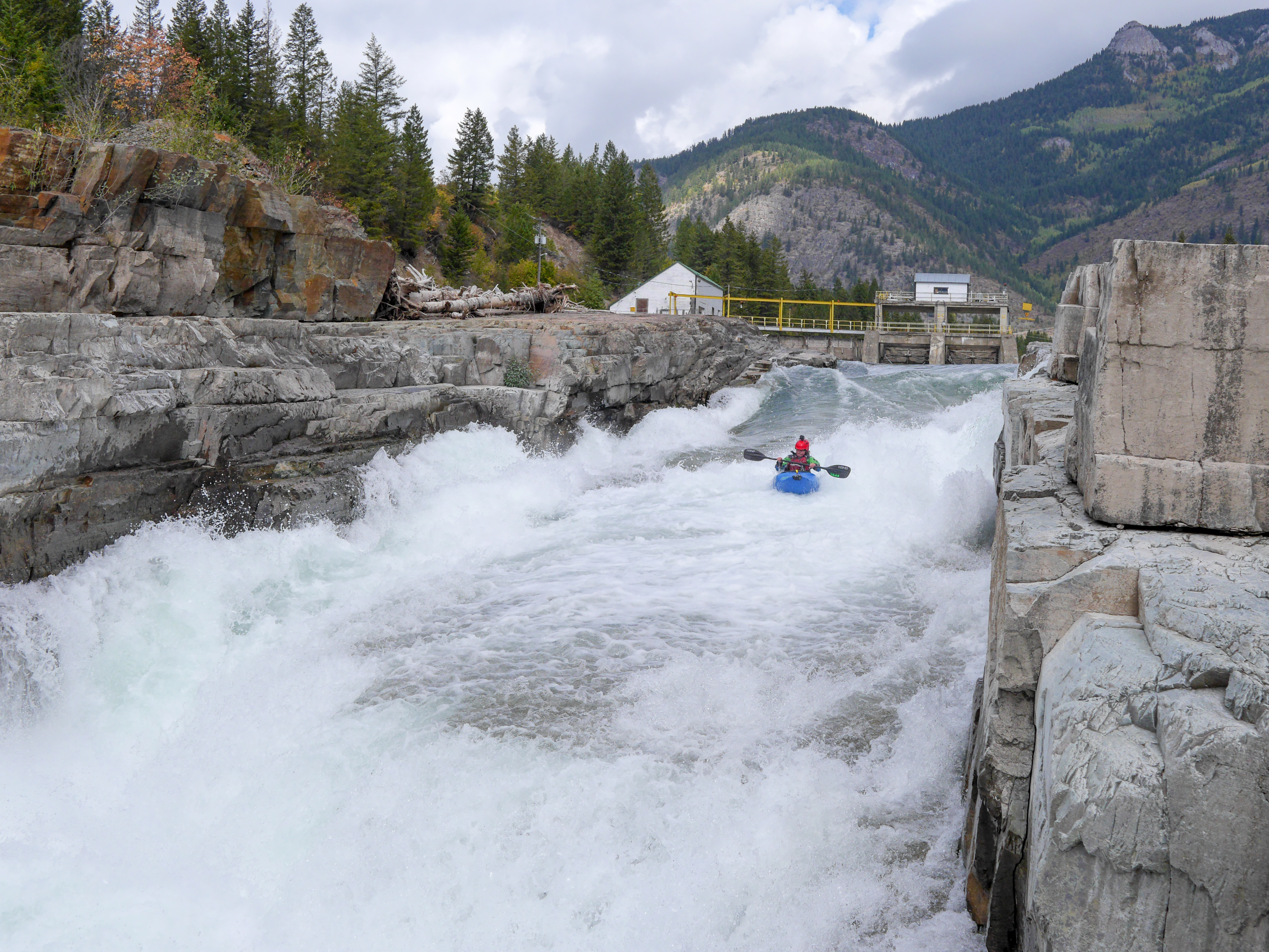 The Elk is the classic run of the Kootenays. The Elk packs a punch with a number of challenging boxed in rapids, including a 40′ waterfall, all of the course of 2 miles. Runs down the Upper Elk start on the lake in Elko just upstream of the dam. Paddle on the flat water for about 400 meters to get to the dam. BC Hydro wants people to portage on the left and not run the dam so be respectful. A short paddle across the pool below the dam brings you to the first rapid, a long slide. The slide can be run in the center of the main channel, just charge left the whole time to avoid getting pushed into the right wall. If your feeling adventuresome go for the boof line and boof the left channel on to the slide.