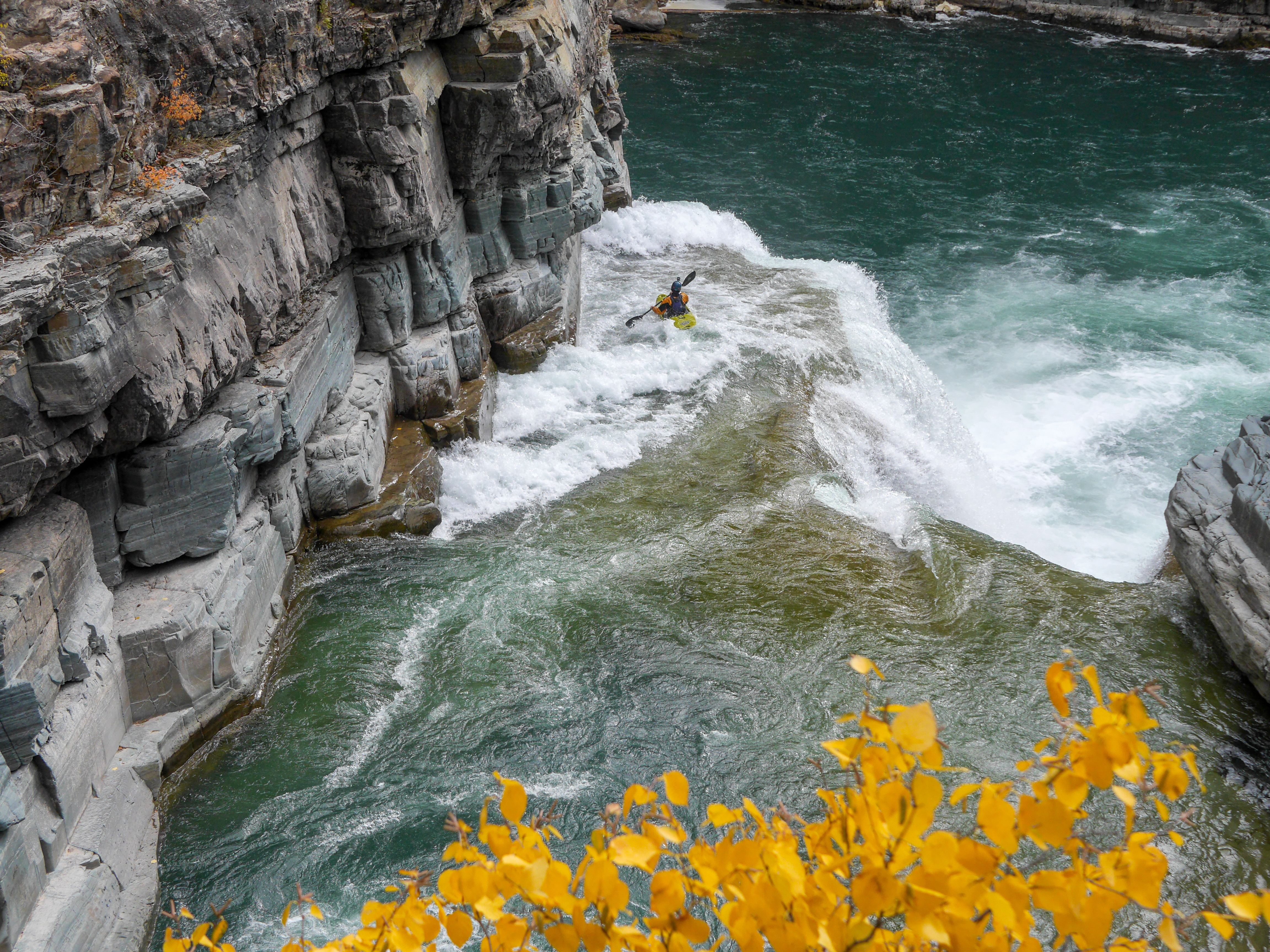 Once you do the 20′ seal launch your committed to running the waterfall. The seal launch is normally done far right into the big eddy. At high water you can also go off the side of the seal launch but make sure you keep your bow up because its supper shallow there. There’s a few eddies to catch in the canyon above the waterfall if you want to regroup with your buddies. The normal line on the waterfall is to cross the guard curlers and make it out onto the left shelf, then turn and melt down into the fold. The waterfall also gets run on the right side sometimes when the waters low.